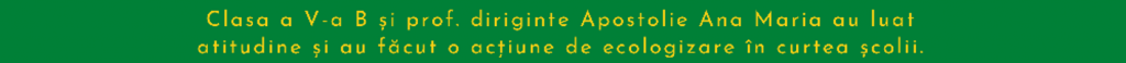 Elevii clasei a V-a B, sub îndrumarea prof. Ana Maria Apostolie, s-au înscris în programul 4/4 PENTRU PRIETENI, organizat de American Councils for International Education în parteneriat cu Ambasada Statelor Unite ale Americii: https://americancouncils.ro/44pentruprieteni/Vrancea/. Elevii au curățat curtea interioară a școlii și au primit diplome, stickere și recunoștință. La finalul activității, elevii erau foarte bucuroși pentru că au realizat activitatea și au ajutat la curățarea planetei.